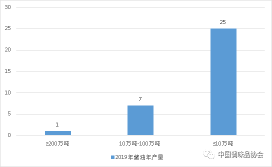 ? ? ? 中國(guó)著名品牌企業(yè)100強(qiáng)數(shù)據(jù)統(tǒng)計(jì)顯示,2019年百?gòu)?qiáng)企業(yè)中醬油產(chǎn)量分布呈現(xiàn)金字塔狀。年產(chǎn)量超過(guò)100萬(wàn)噸有1家,10-100萬(wàn)噸有7家,10萬(wàn)噸以下有25家。