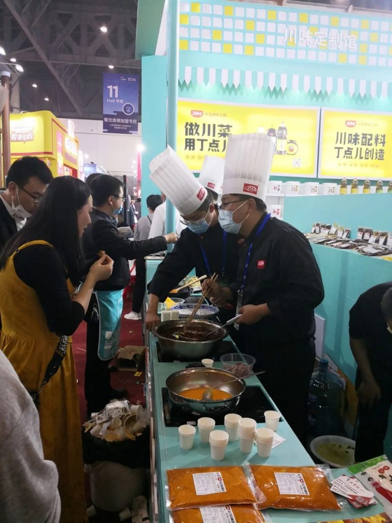 ? ? ?四川丁點(diǎn)兒股份針對(duì)流通、餐飲定制和家庭廚房調(diào)味料,現(xiàn)場產(chǎn)品展示突出搶眼、菜品應(yīng)用色香味型俱全。干鍋醬、椒麻雞汁、老壇酸菜魚、金湯酸辣醬、川味辣鹵汁、麻辣(蒜香)小龍蝦、油醋汁、姬松茸菌湯等經(jīng)典川菜調(diào)料明星產(chǎn)品隆重亮相,吸引了大批參會(huì)者前來品嘗并達(dá)成合作意向。