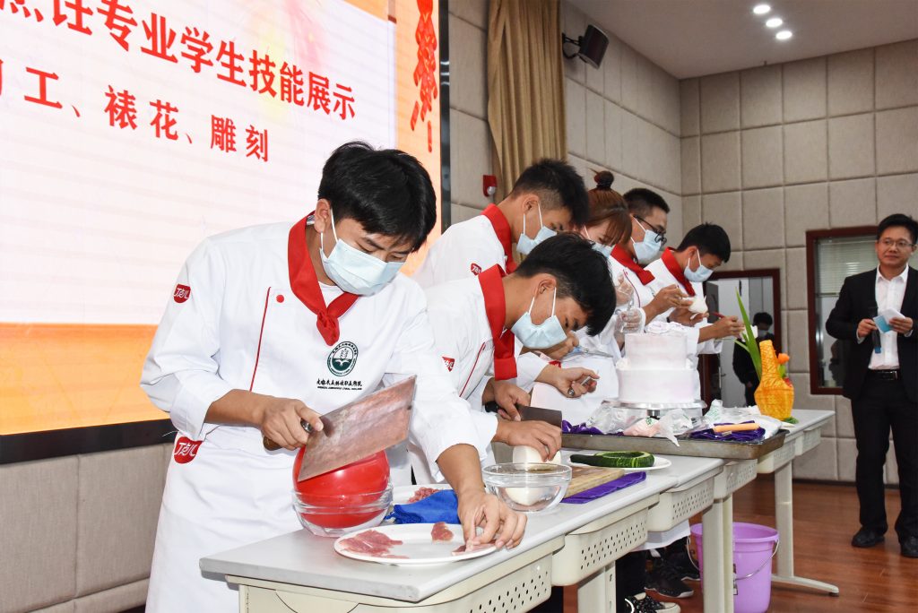? ? ? ?隨后,新生代表在現(xiàn)場進(jìn)行了刀工、裱花、雕刻等烹飪相關(guān)技藝展示,熟練的操作和精致的作品吸引了在場所有人員目光,并紛紛拍照留念。