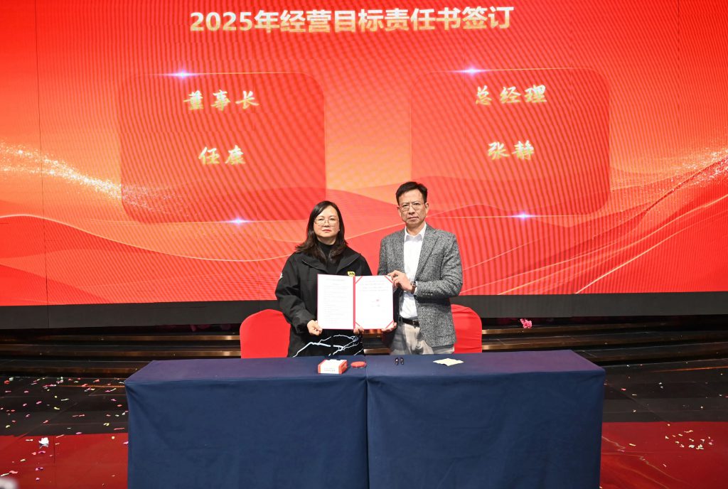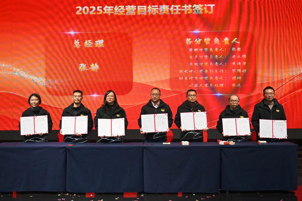 2024年,始終堅持公司利益第一,市場發(fā)展優(yōu)先的市場發(fā)展理念,丁點兒人上下一心,成功實現(xiàn)年度經(jīng)營目標。2025年,踏上新的征程,任康董事長、張靜總經(jīng)理與各分管團隊代表簽訂《2025年經(jīng)營目標責(zé)任書》。