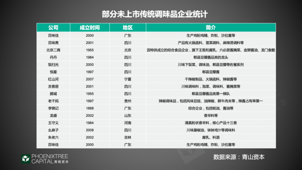 其中,未上市傳統(tǒng)調(diào)味品企業(yè)也是賽道重要玩家,主要呈現(xiàn)2大特點(diǎn):1)普遍體量大,已成為細(xì)分品類的頭部。來自公司官方數(shù)據(jù),辣椒醬龍頭老干媽,2019年銷售收入破50億元,同比上漲14.43%;香辛料龍頭王守義,2019年?duì)I收超30億元。2)品類上,川貴地區(qū)的辣椒調(diào)味品居多,如老干媽、百味齋、丹丹、飯掃光、恒星等。由于良好的現(xiàn)金流,經(jīng)營理念偏傳統(tǒng),這類企業(yè)融資需求往往并不強(qiáng)烈。