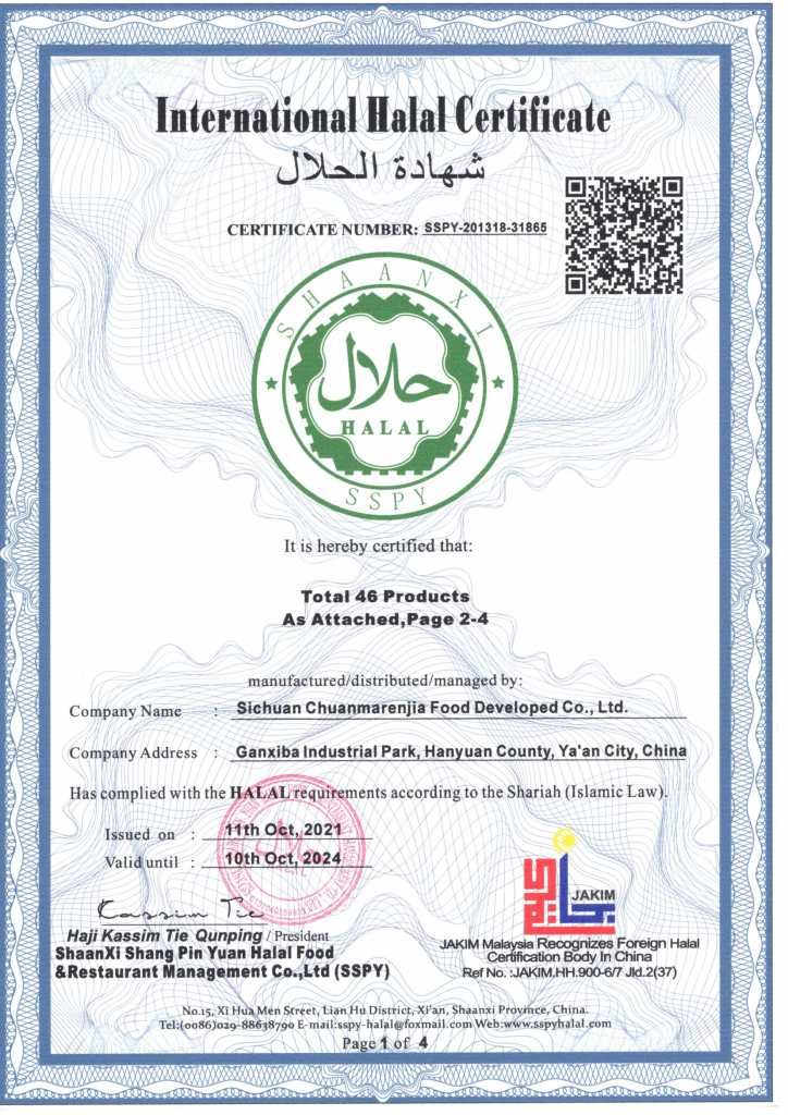 ? ? ? ?清真認(rèn)證,即符合穆斯林生活習(xí)慣和需求的食品、藥品、化妝品以及食品、藥品、化妝品添加劑。為響應(yīng)國(guó)家“一帶一路”倡議,滿足沿線國(guó)家對(duì)清真產(chǎn)品不斷擴(kuò)大的市場(chǎng)需求,川麻人家抓住機(jī)遇,依托母公司丁點(diǎn)兒股份專注川菜標(biāo)準(zhǔn)化調(diào)味品22年的生產(chǎn)技術(shù)及產(chǎn)品研發(fā)優(yōu)勢(shì),專注于漢源花椒及清真復(fù)合調(diào)味品研發(fā)、生產(chǎn)、加工,致力于清真美食的創(chuàng)新與推廣,促進(jìn)國(guó)際清真飲食文化交流和發(fā)展。