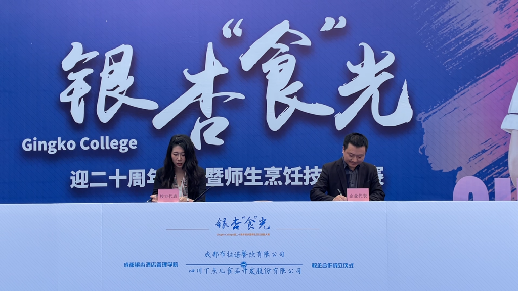 ? ? ? ?隨后,成都銀杏酒店管理學院酒店管理系執(zhí)行系主任徐君宜、丁點兒股份技術(shù)中心產(chǎn)品應用培訓部副部長陳證宇代表雙方簽署戰(zhàn)略合作協(xié)議。徐主任代表學校向丁點兒股份授予了“校企合作”牌匾。至此,雙方正式達成校企合作共識。希冀通過雙方的共同努力,將丁點兒股份的品牌文化及產(chǎn)品風味根植在餐飲烹飪學子的心中,同時促進成都銀杏酒店管理學院烹飪學院優(yōu)秀畢業(yè)生將富含丁點兒風味的美食作品更多的呈現(xiàn)在消費者的餐桌之上。