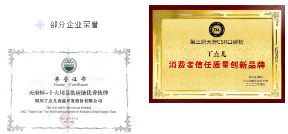 憑借企業(yè)出色的行業(yè)影響力和巨大的發(fā)展?jié)摿?,丁點(diǎn)兒股份先后獲得“中國餐飲供應(yīng)鏈TOP榜頭部品牌”、2022“天府杯”十大川菜供應(yīng)鏈優(yōu)秀伙伴、成都市安全文化建設(shè)示范單位、“消費(fèi)者信任質(zhì)量創(chuàng)新品牌”等眾多榮譽(yù)。