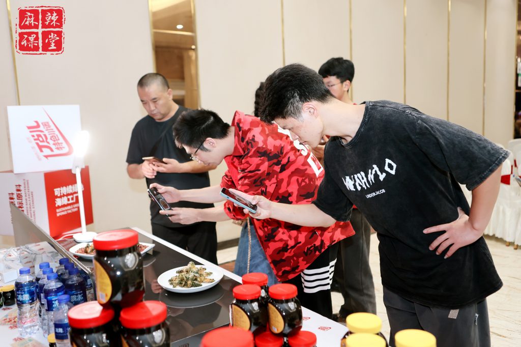 丁點兒高品質(zhì)特色川調(diào)產(chǎn)品展示區(qū),藤椒油、干鍋醬、椒麻雞汁、金湯酸菜醬等豐富的產(chǎn)品吸引了眾多參會人員駐足詢問了解,其口味穩(wěn)定,快速出餐,可優(yōu)化菜品成本,有效提高翻臺率等優(yōu)勢給大家留下了深刻印象。在品嘗過用丁點兒藤椒油制作的藤椒手撕雞后,大家更是贊不絕口,一致好評。