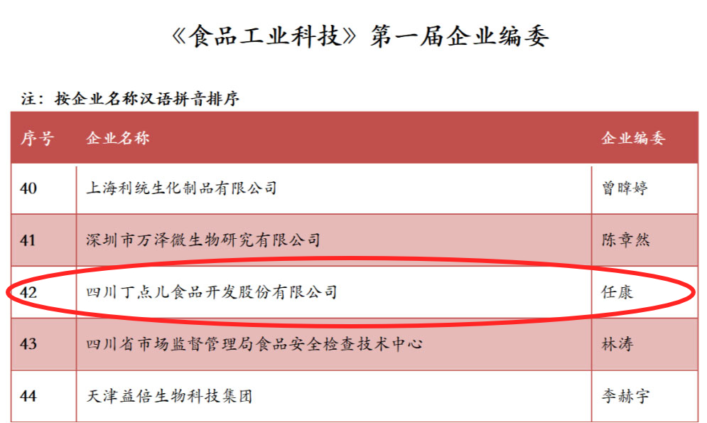 近日,中國(guó)權(quán)威學(xué)術(shù)期刊《食品工業(yè)科技》第一屆企業(yè)編委專家名單公布,四川丁點(diǎn)兒食品開發(fā)股份有限公司董事長(zhǎng)任康成功當(dāng)選。